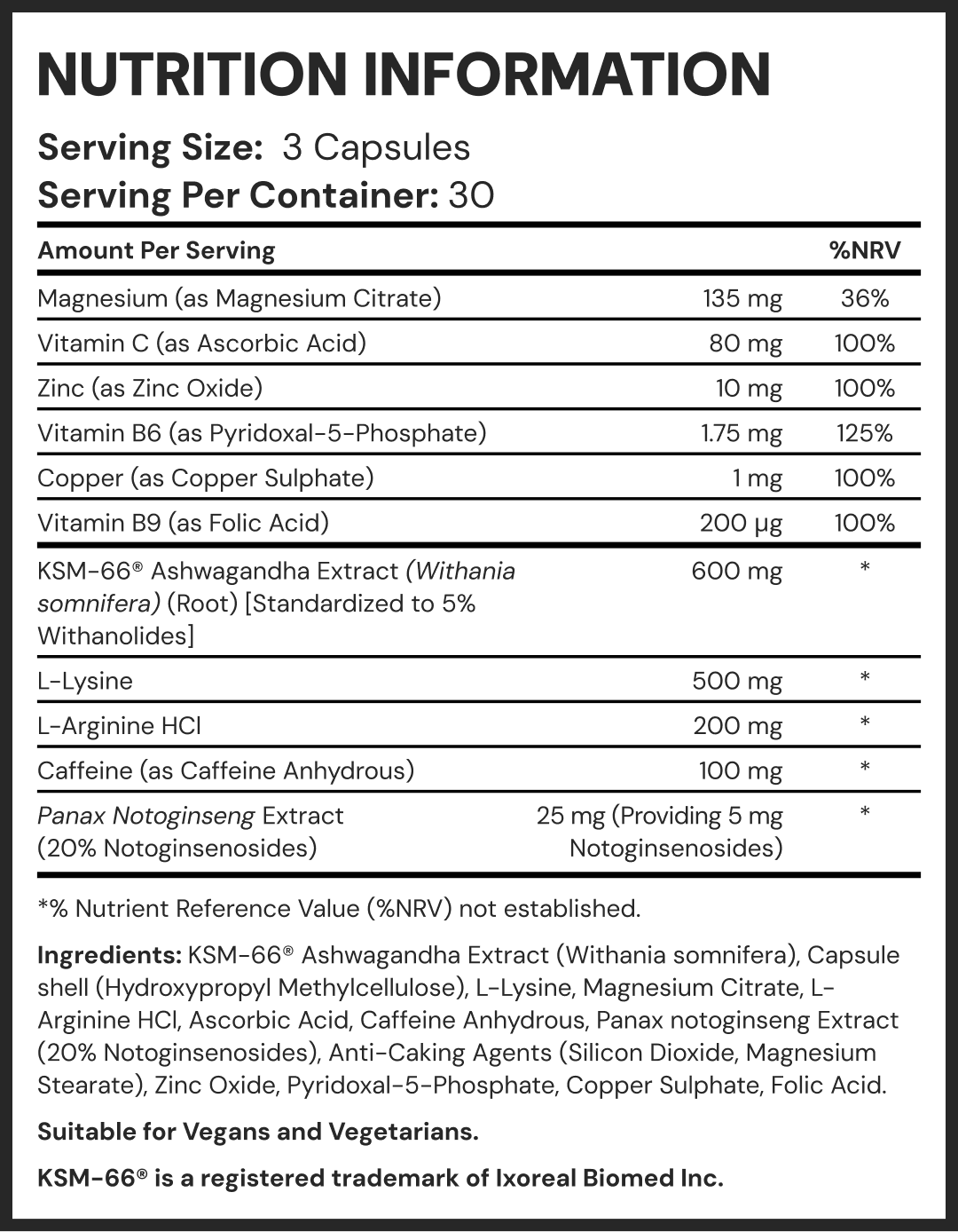 KSM-66® AshwagandhaWithania somnifera L.Une étude clinique a montré que les hommes qui ont pris de l'ashwagandha pendant 8 semaines ont réalisé des gains de développé couché beaucoup plus importants que les hommes qui ont pris un placebo. Cette étude suggère également que l'ashwagandha réduit le temps de récupération musculaire et le pourcentage de graisse corporelle en augmentant la testostérone[6]